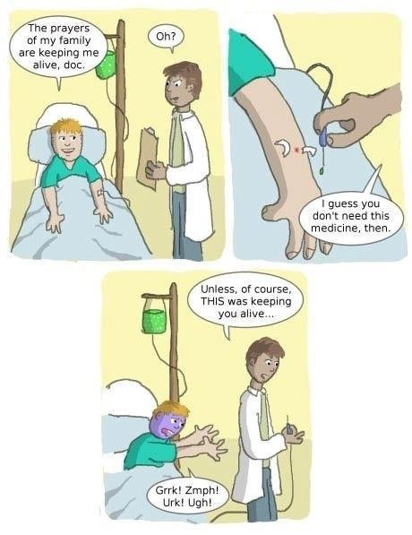 Secondly, while miraculous healings occur (at least events that have been recorded may be interpreted as so inside a theistic framework); medical science and prayer are not opposed as in the strawman cartoon above. There have been some tragic cases in the media where they have been opposed by Christians and people have died; but there is no firm biblical warrant to back such irresponsible behaviour up. Paul had a physician and yet no doubt prayer. His thorn in the flesh may have been an issue with eyesight, we don't know. The only reference I know of that is antagonistic is in 2 Chronicles, where Asa is criticised for seeking physicians rather than the Lord. We need to keep in mind he was not pursuing medicine in any way we'd understand it but the equivalent of black magic.